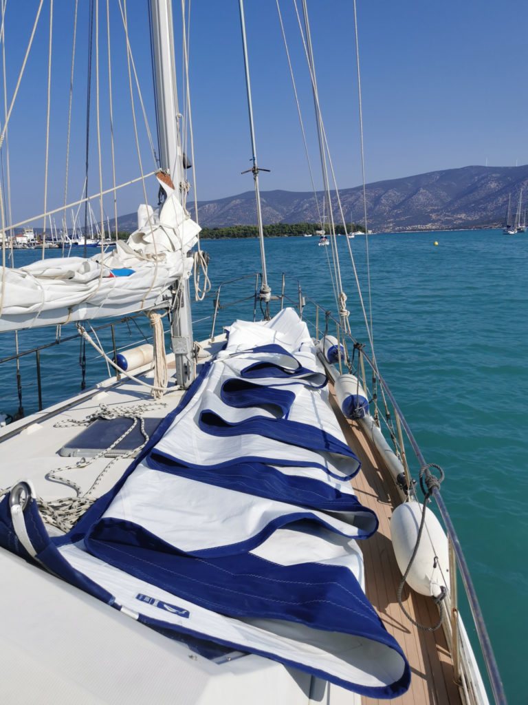 Solange die SANA noch im Wasser ist, nutze ich die kühlere Zeit um schon etliche Abschlußarbeiten zu erledigen. Der größte Brocken dabei, war sicher, die neue Genua gut runterzubringen und ordentlich zusammenzulegen.