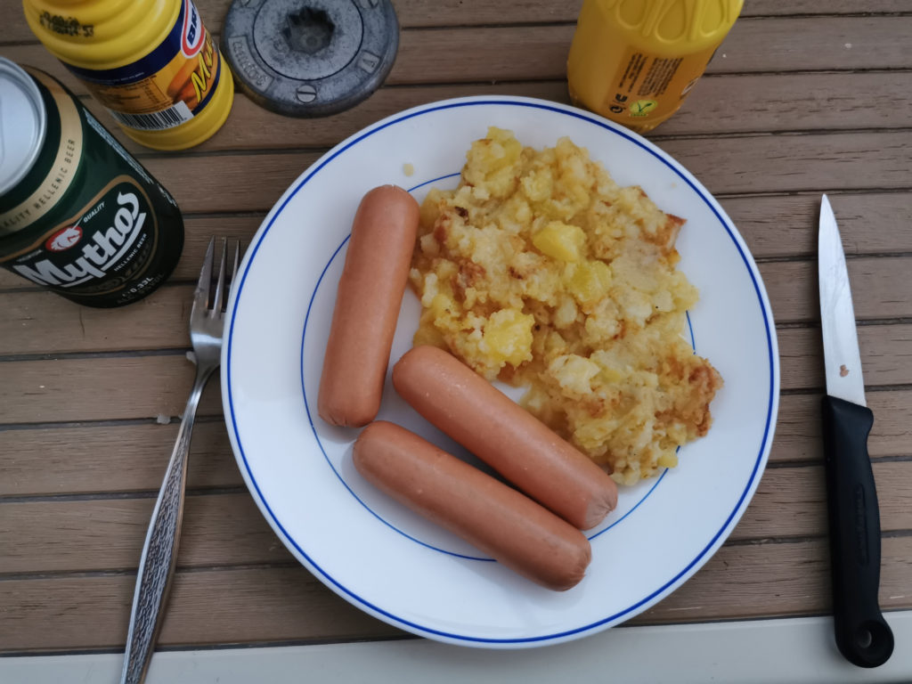 Die letzten Vorräte werden zu einem leckeren Abendessen verarbeitet. Ist sich ziemlich genau auf den Punkt ausgegangen. Die letzten Erdäpfel und die letzten Käsefrankfurter. Nur das Mythos ist zum Glück noch nicht aus.