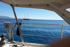 Da kommen die Fallböen nicht so heftig wie ganz drinnen in der Bucht. Aber bei wenig Wind (morgen, übermorgen) ist das Ankern und Schwimmen dort im türkisblauen Wasser wunderbar. Das wissen aber leider viele andere auch.